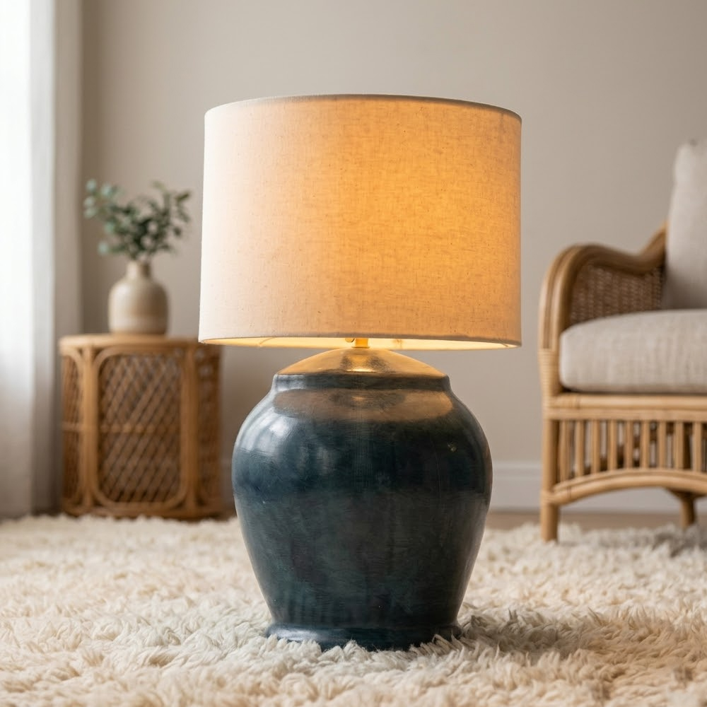 Abajur em Cerâmica Azul e Cúpula de Tecido A60 x...