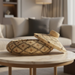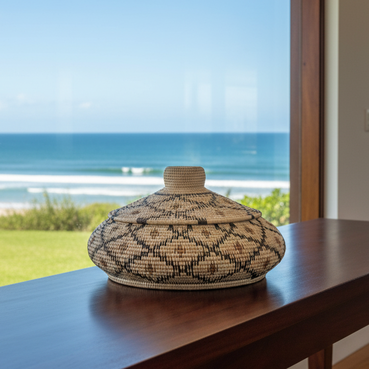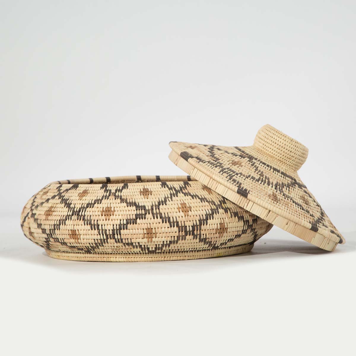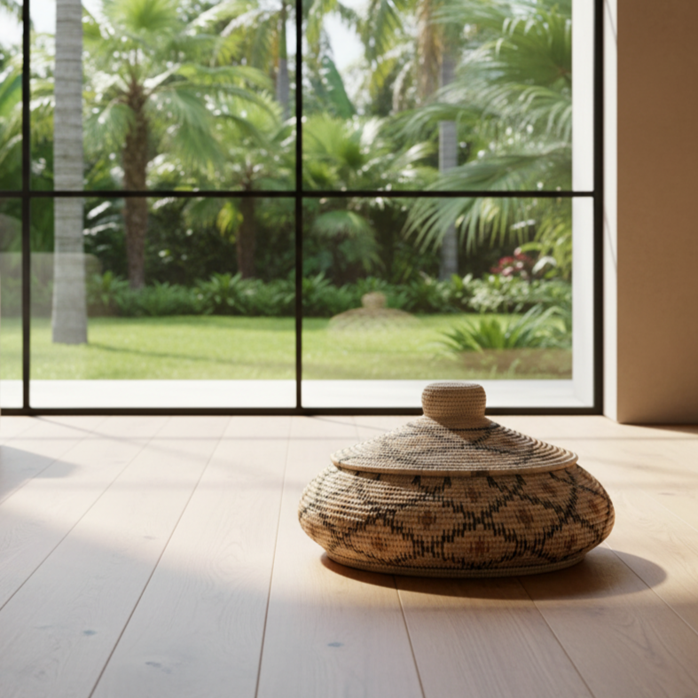 Artesanal e expressivo, este cesto baixo com tampa traz um padrão de losangos que evoca elementos tribais com elegância e leveza. Feito à mão com fibras naturais e pigmentos em tons suaves, ele é perfeito para compor ambientes com alma, textura e autenticidade.