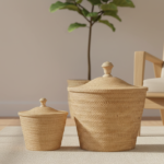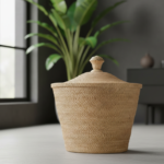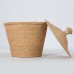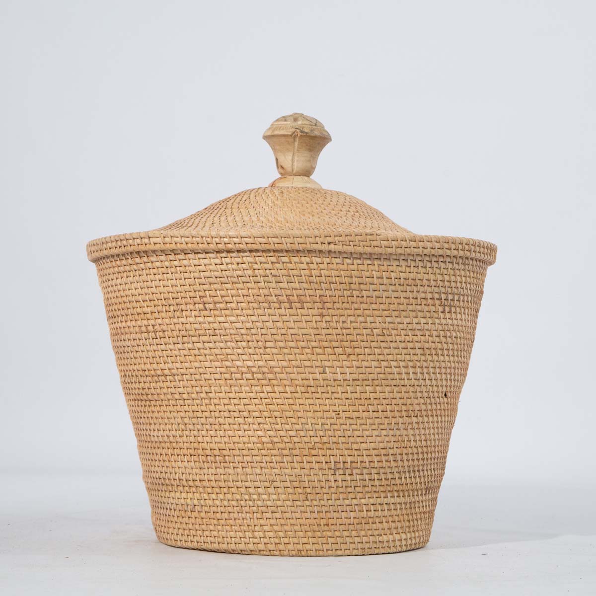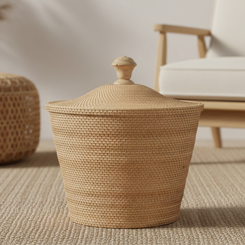 Inspirado na estética do essencial, este cesto de fibra natural une funcionalidade e beleza artesanal. Feito à mão por artesãos balineses, ele apresenta uma trama fina e homogênea, com tampa ajustada e um delicado puxador em formato orgânico.