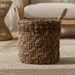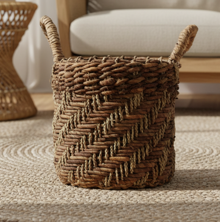 Com um visual robusto e textura marcante, este cesto quadrado é confeccionado artesanalmente com fibras naturais trançadas em padrão zigue-zague. As alças laterais facilitam o manuseio e adicionam charme ao design. Uma peça versátil e sustentável, ideal para organizar mantas, brinquedos, revistas ou plantas, mantendo a decoração elegante e acolhedora.