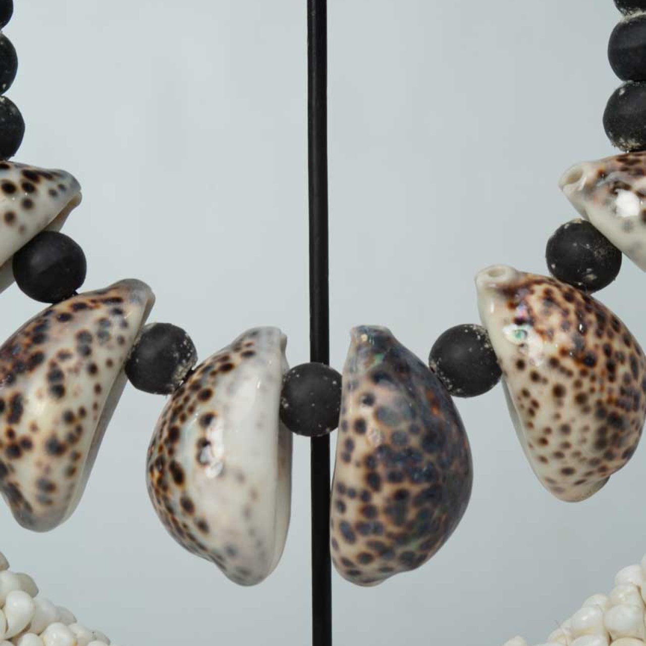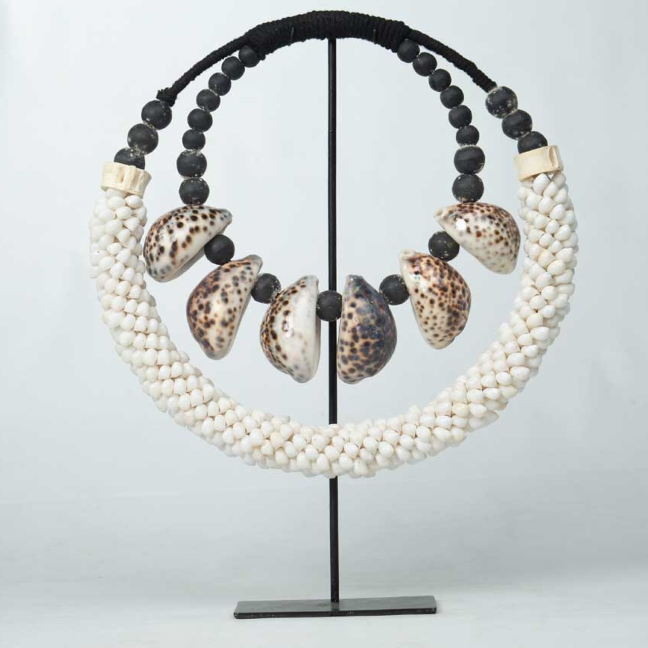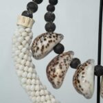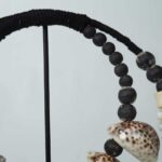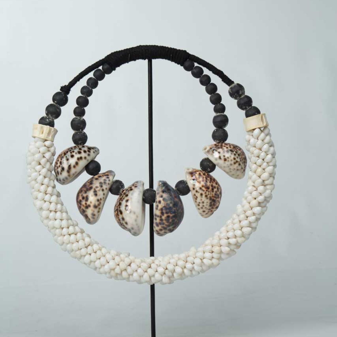 Este colar de parede de formato circular expressa equilíbrio e contraste. Confeccionado com uma base densamente trançada de pequenas conchas brancas, ele é coroado no centro por grandes conchas de búzio tigrado intercaladas com contas negras em pedra vulcânica, criando uma composição harmoniosa entre luz e sombra, suavidade e força.