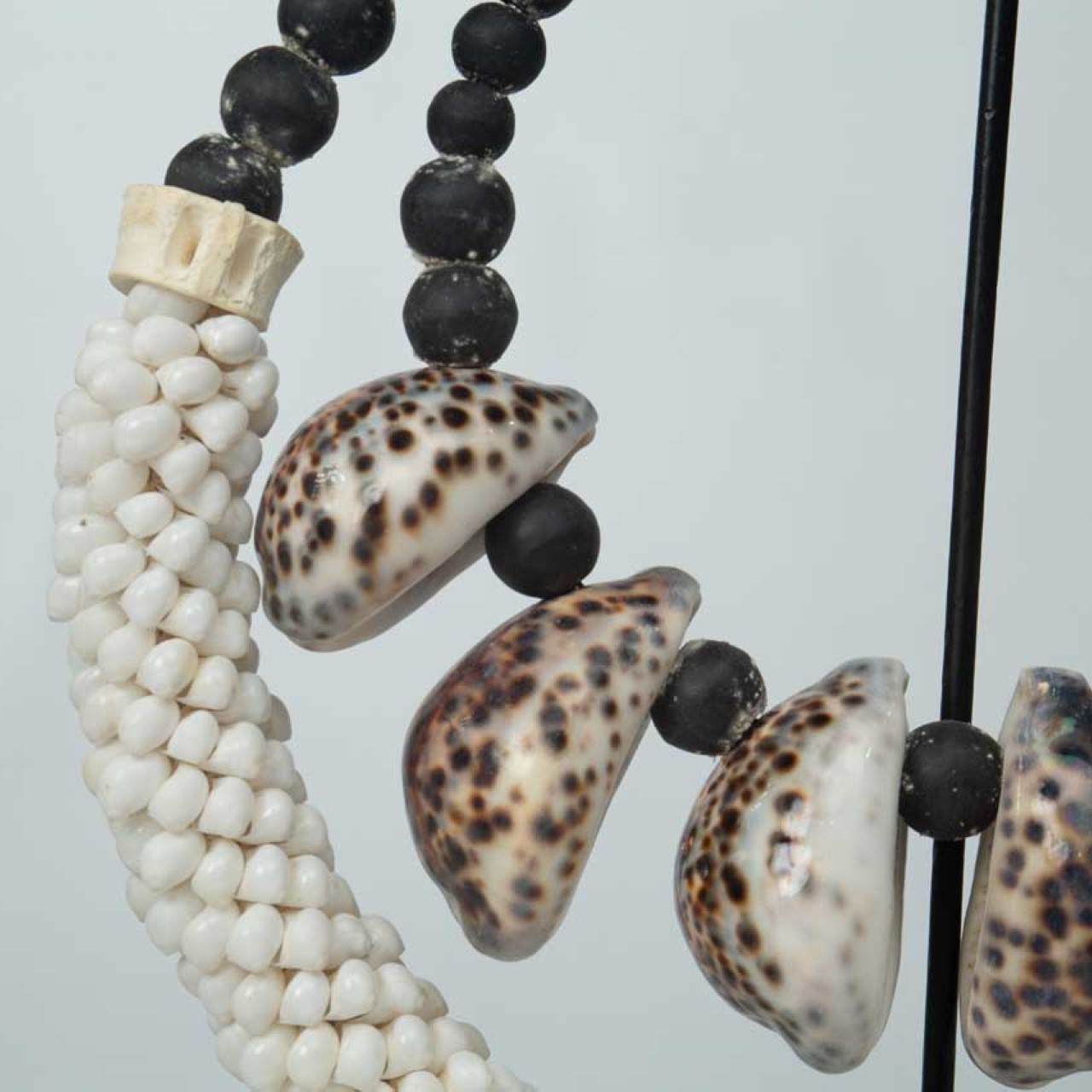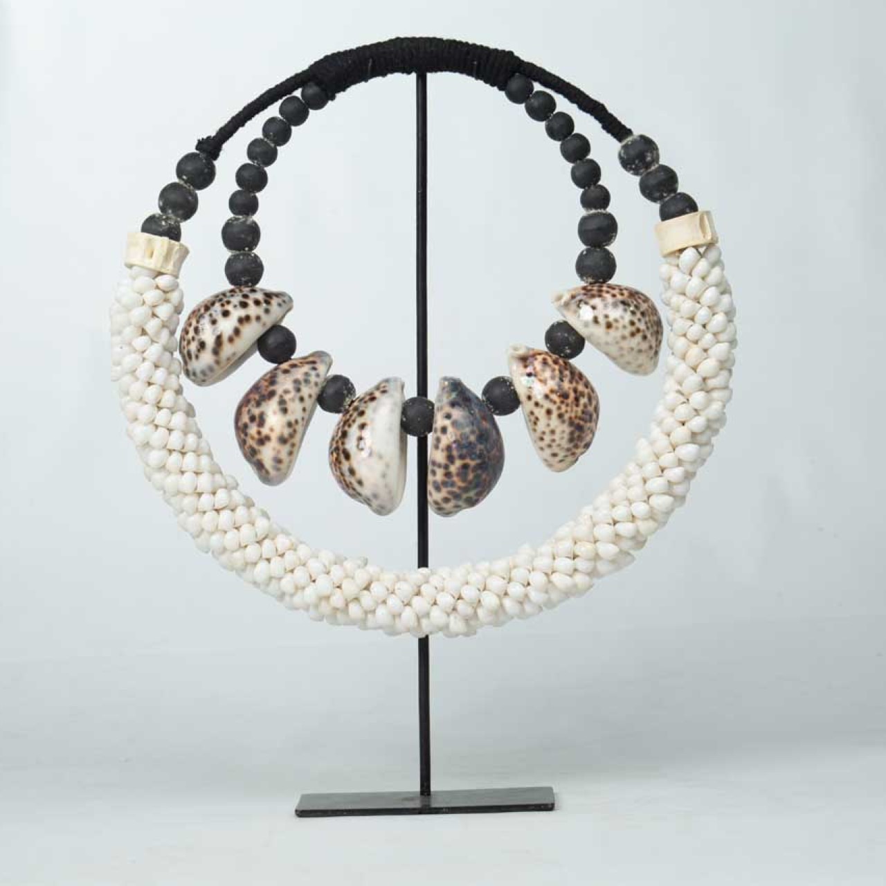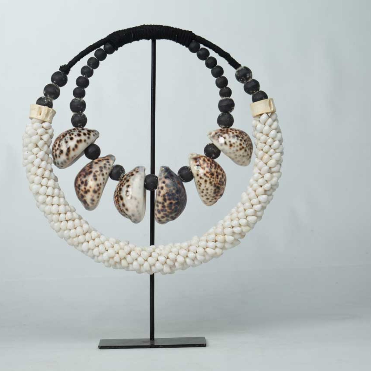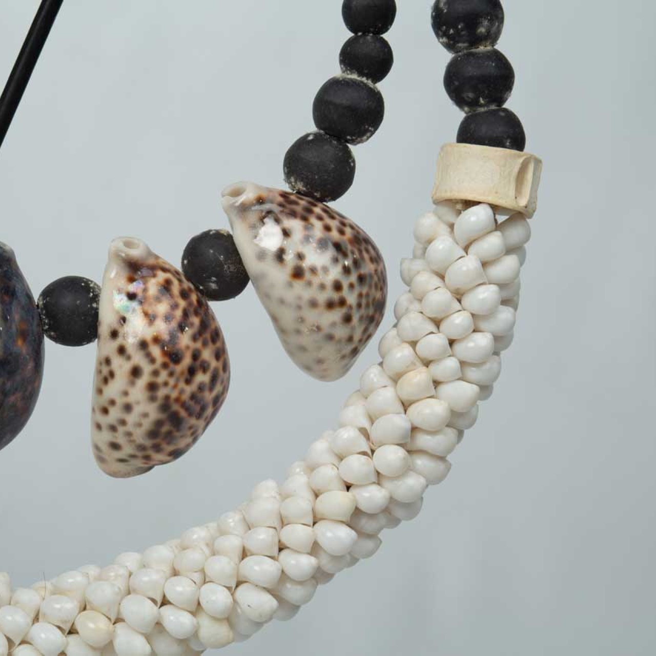 Este colar de parede de formato circular expressa equilíbrio e contraste. Confeccionado com uma base densamente trançada de pequenas conchas brancas, ele é coroado no centro por grandes conchas de búzio tigrado intercaladas com contas negras em pedra vulcânica, criando uma composição harmoniosa entre luz e sombra, suavidade e força.