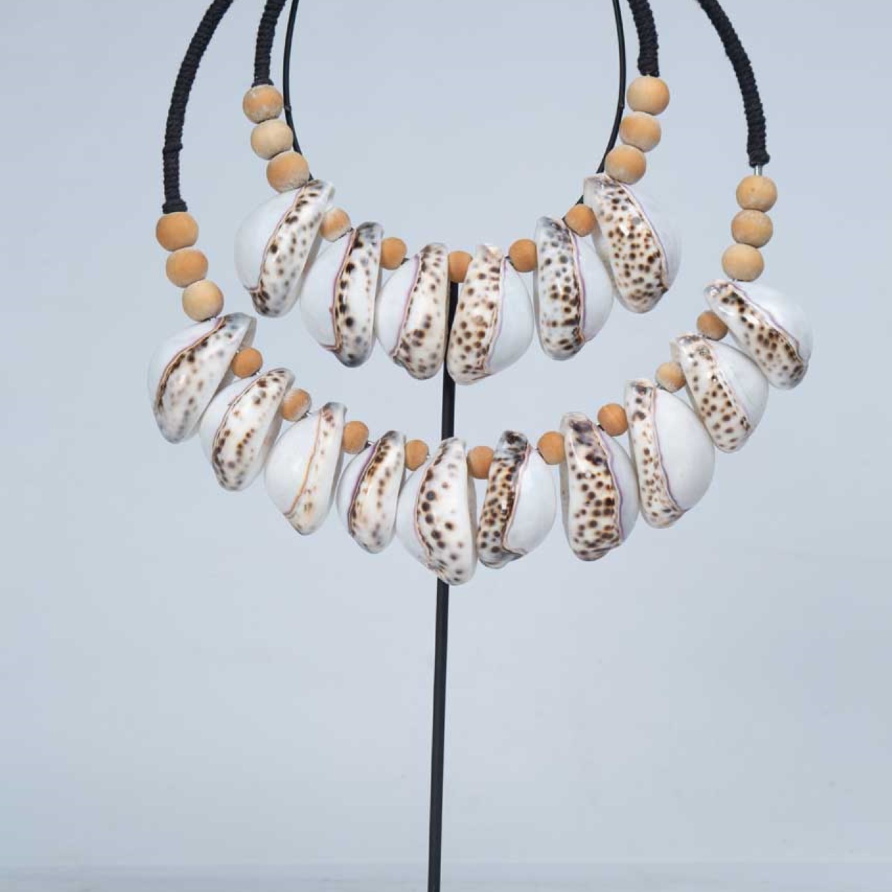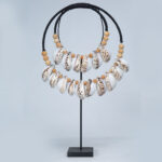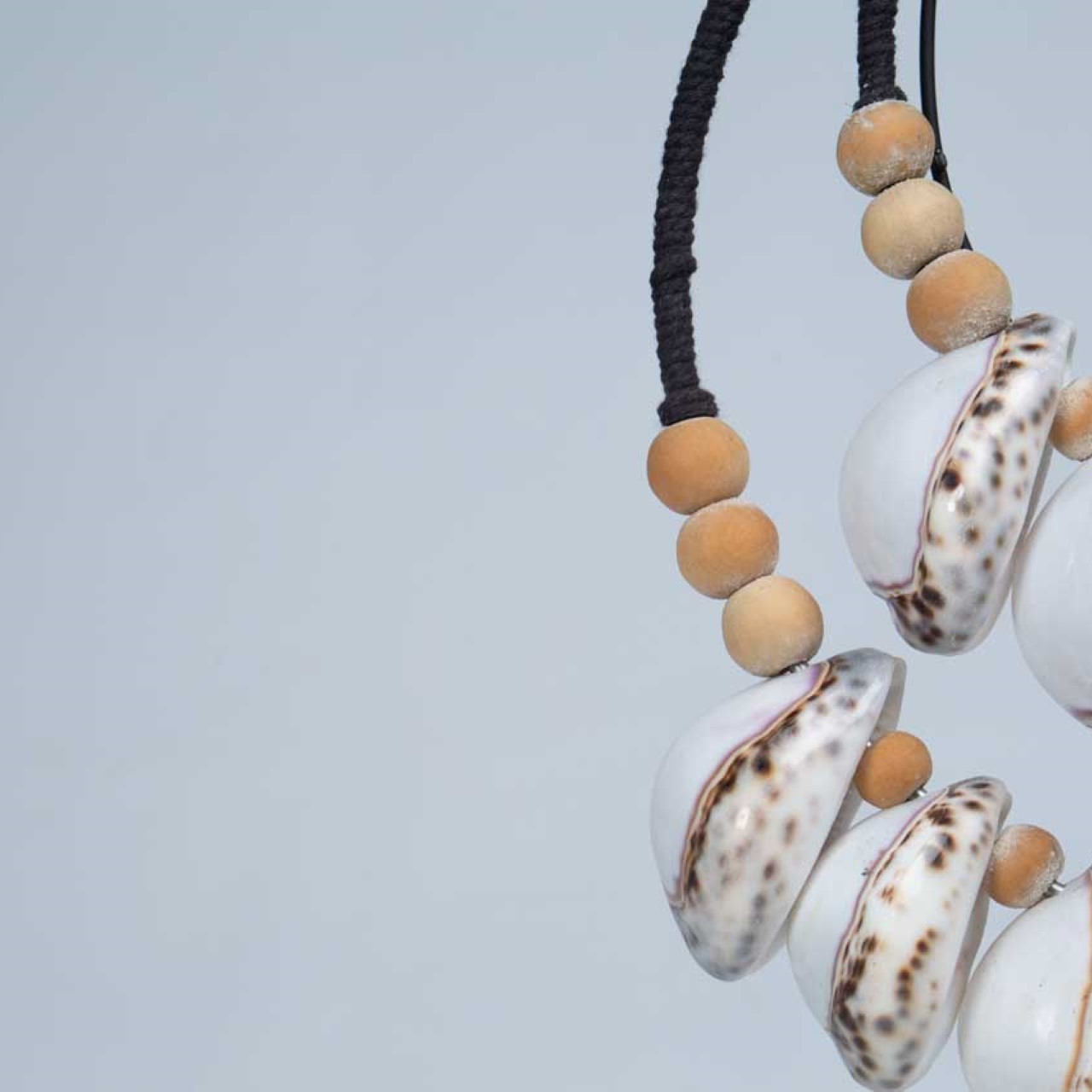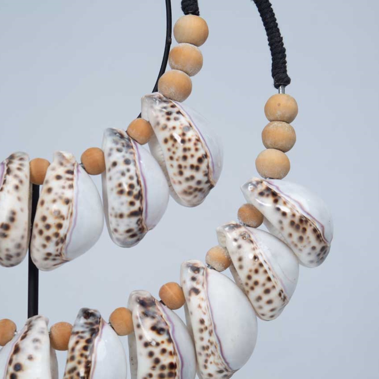Feito à mão em Bali, esse colar decorativo carrega a força simbólica das conchas do oceano com um toque mais suave e natural. Com estrutura envolta em corda preta e base de ferro, é ideal para dar textura e alma a ambientes com estética praiana, boho ou rústica contemporânea.