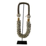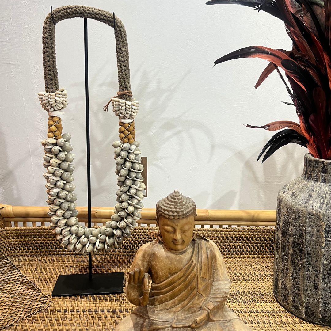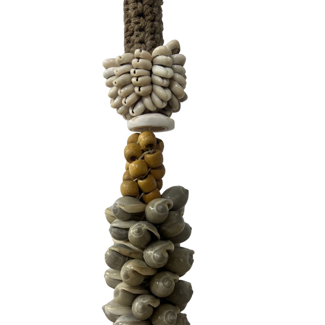 Exuberante e escultural, este colar tribal balinês é feito à mão com dezenas de conchas cônicas em tons naturais cinza, cuidadosamente organizadas para criar uma textura espiral imponente e orgânica. O trançado em fibra natural e os detalhes em conchinhas e sementes completam a composição, que carrega a força e a ancestralidade das ilhas tropicais.