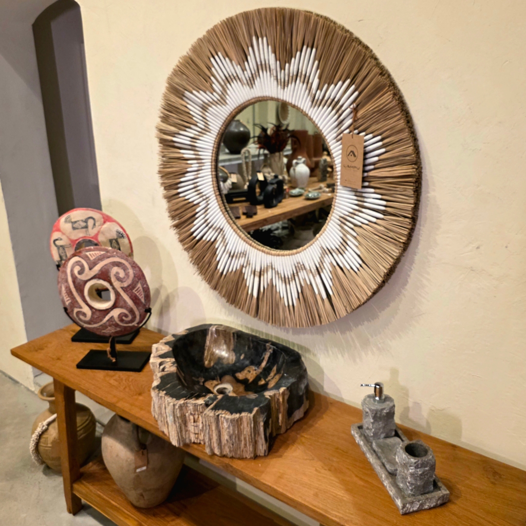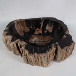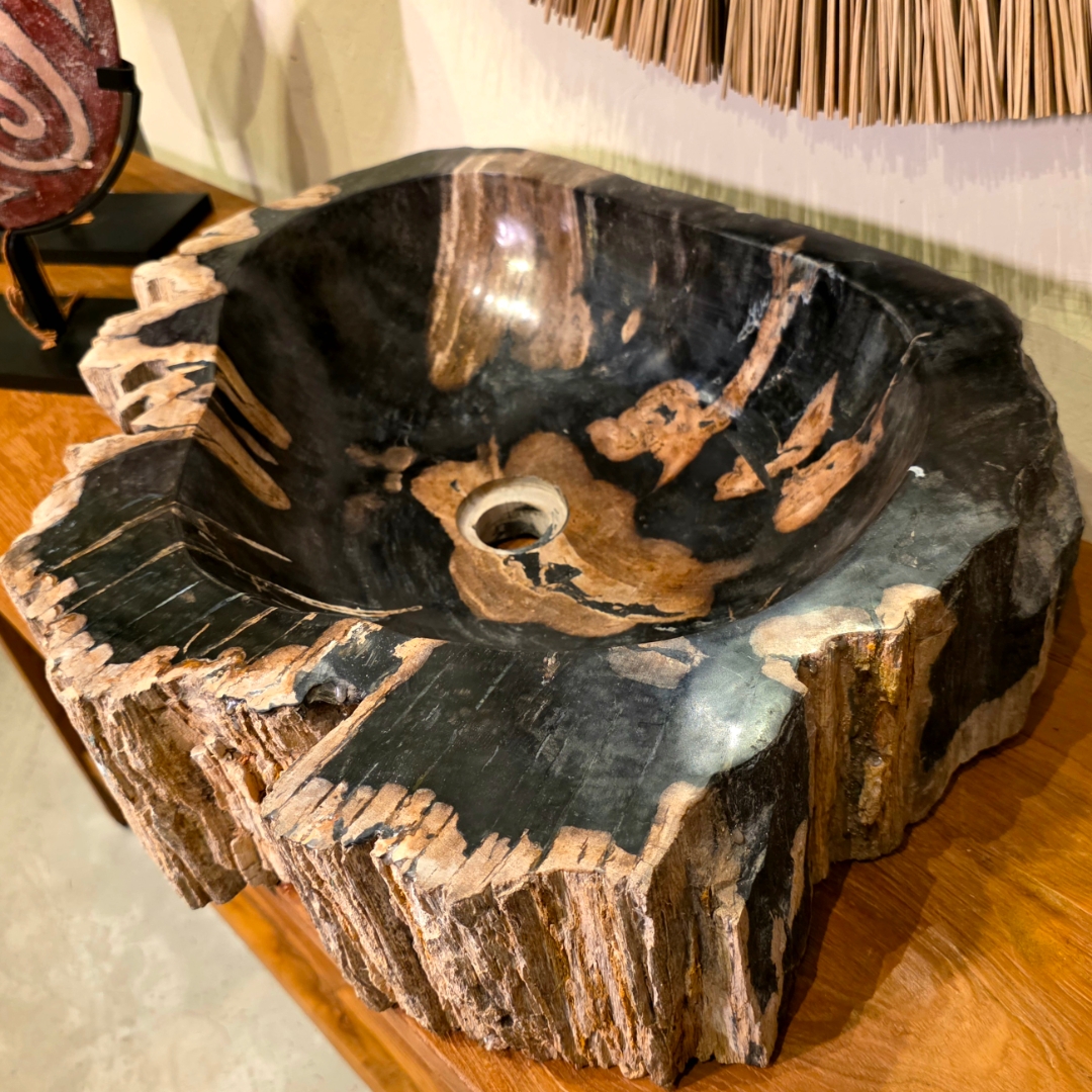 Mais que uma cuba, uma escultura natural com milhões de anos de história. Esta peça única foi formada a partir da fossilização de troncos de árvores, um processo natural que transforma madeira em pedra ao longo de milênios. O contraste entre a textura rústica externa e o acabamento polido interno revela as nuances orgânicas e as cores profundas da madeira petrificada.