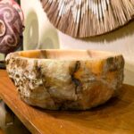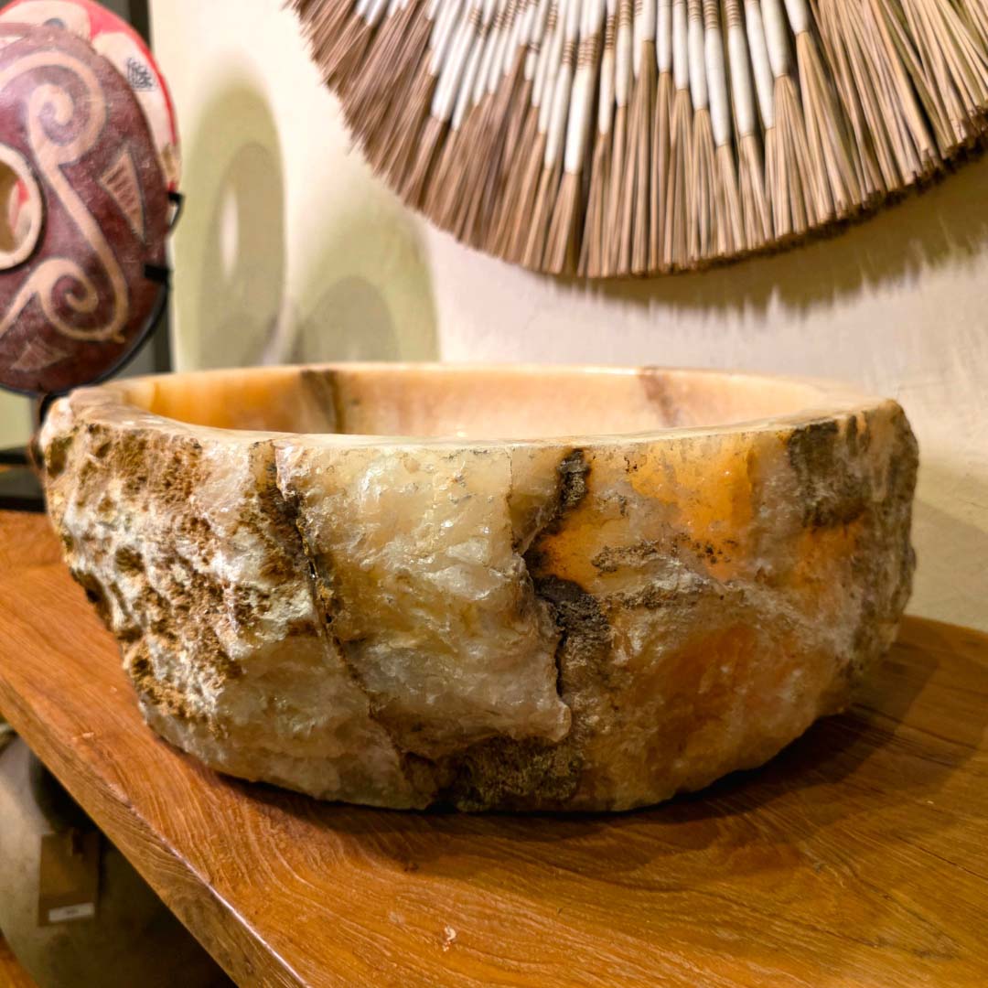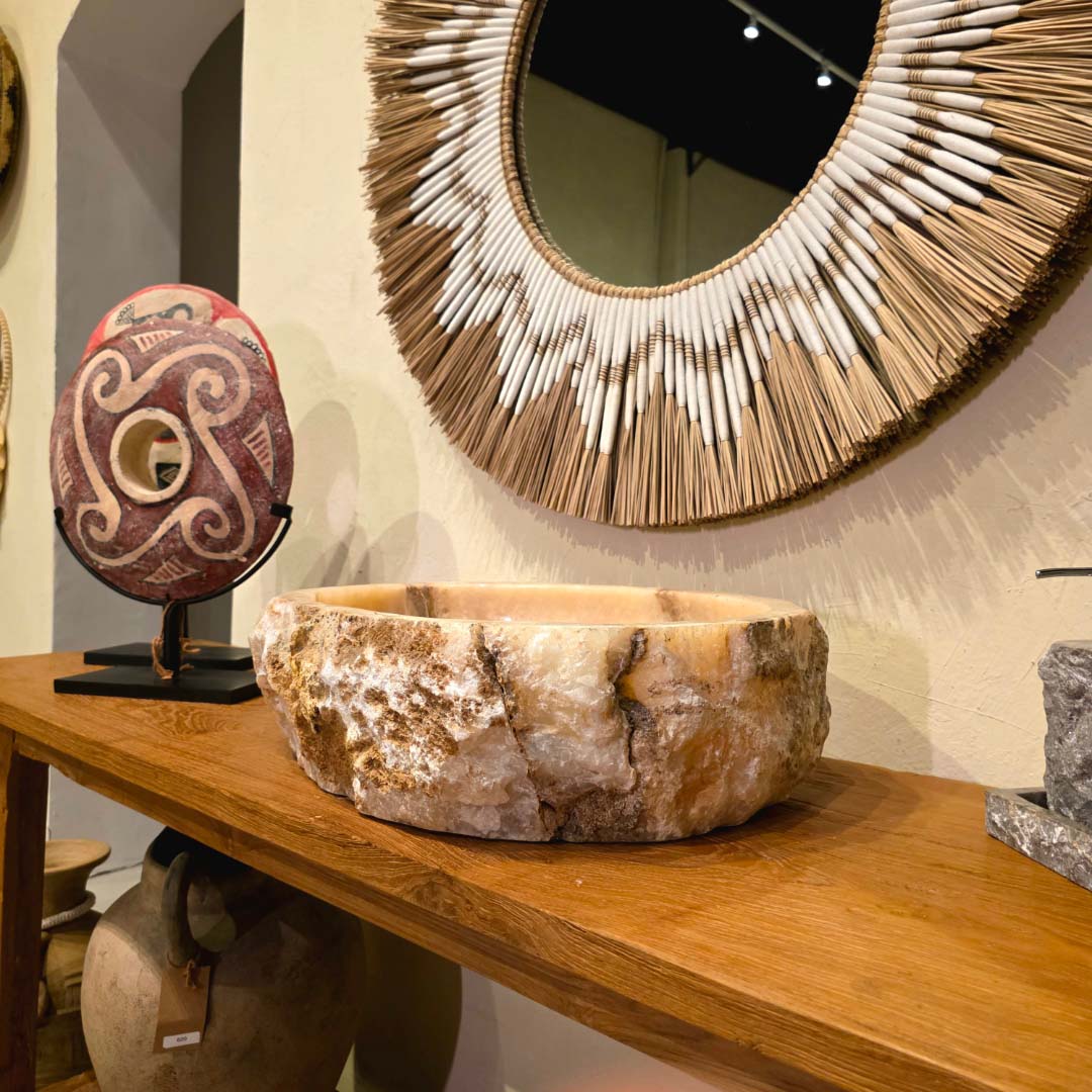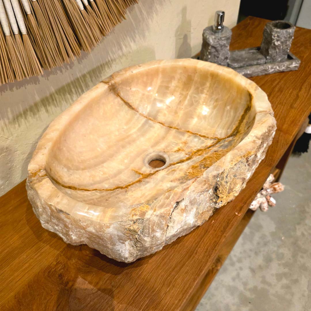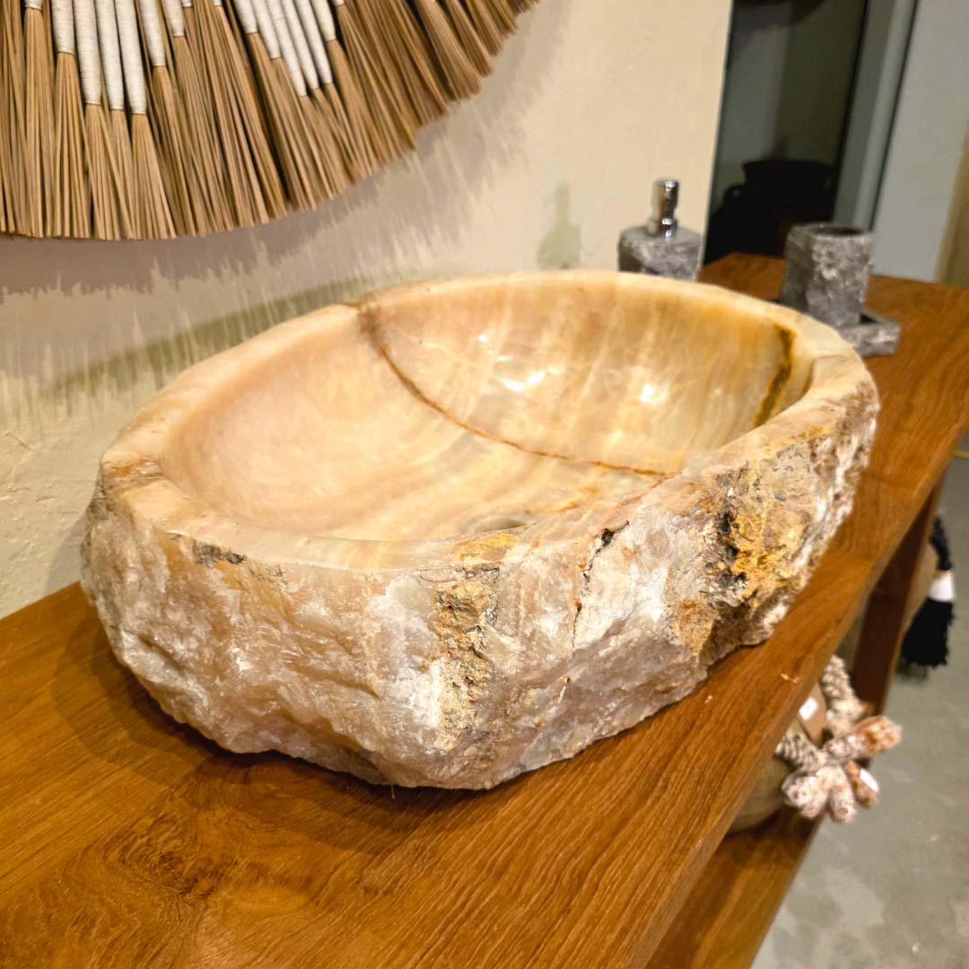 Esculpida à mão a partir de uma única peça de pedra natural, essa cuba de apoio exibe a beleza orgânica do ônix rosado, com veios marcantes e bordas irregulares que preservam a textura original da rocha. Ideal para banheiros que buscam um toque de exclusividade e natureza bruta.
