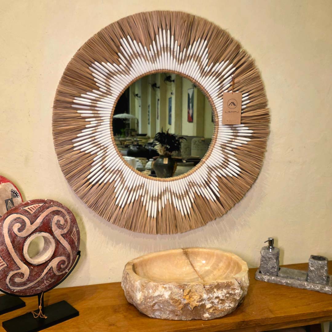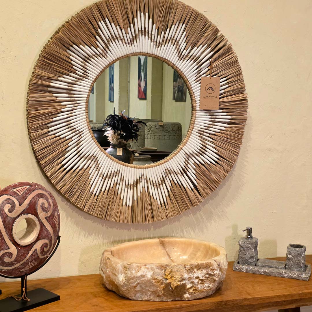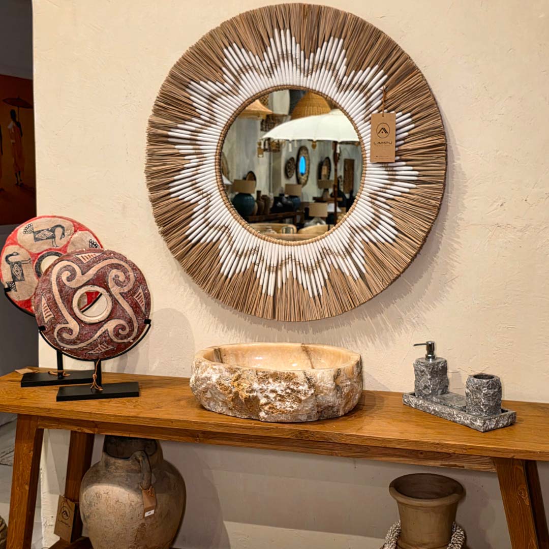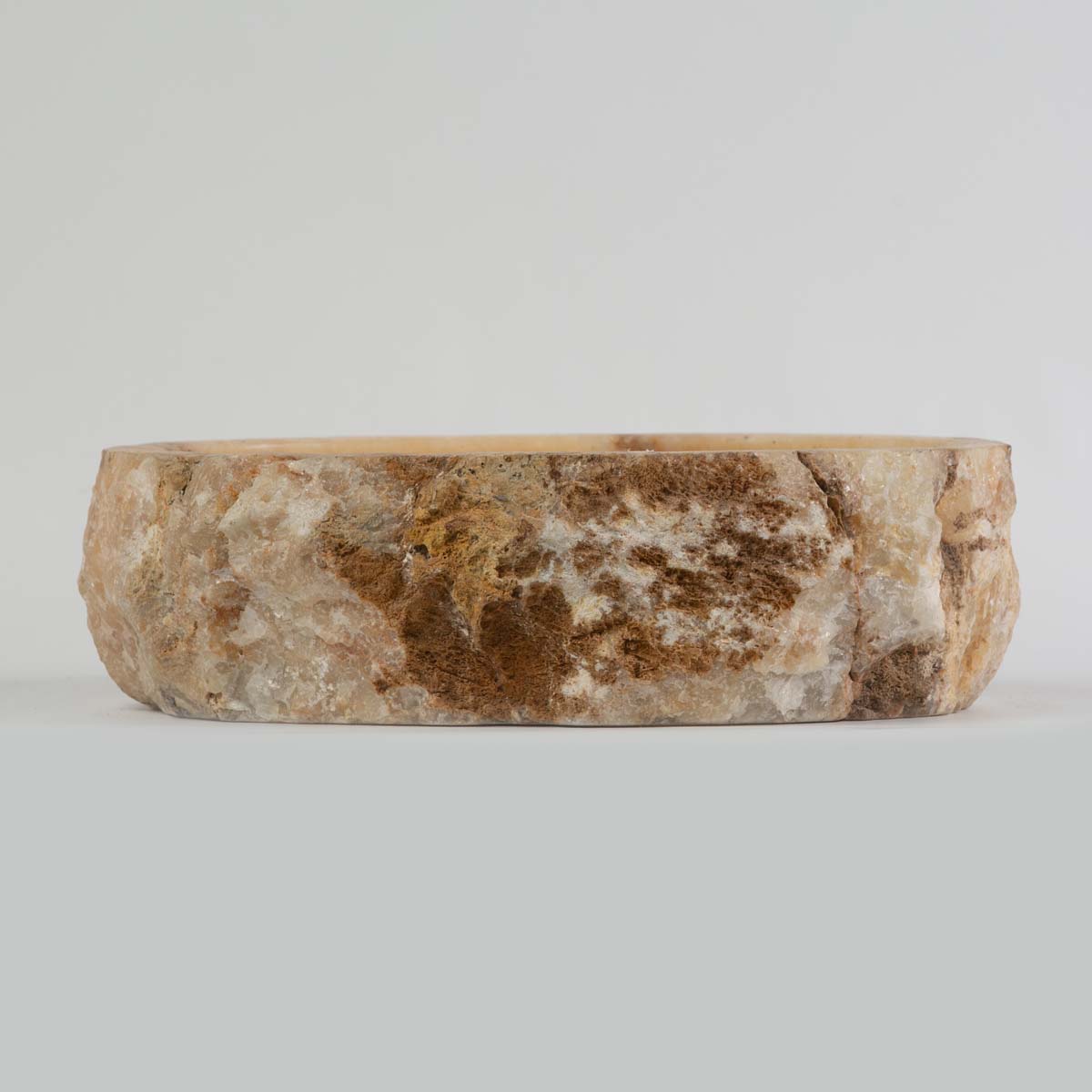 Esculpida à mão a partir de uma única peça de pedra natural, essa cuba de apoio exibe a beleza orgânica do ônix rosado, com veios marcantes e bordas irregulares que preservam a textura original da rocha. Ideal para banheiros que buscam um toque de exclusividade e natureza bruta.