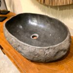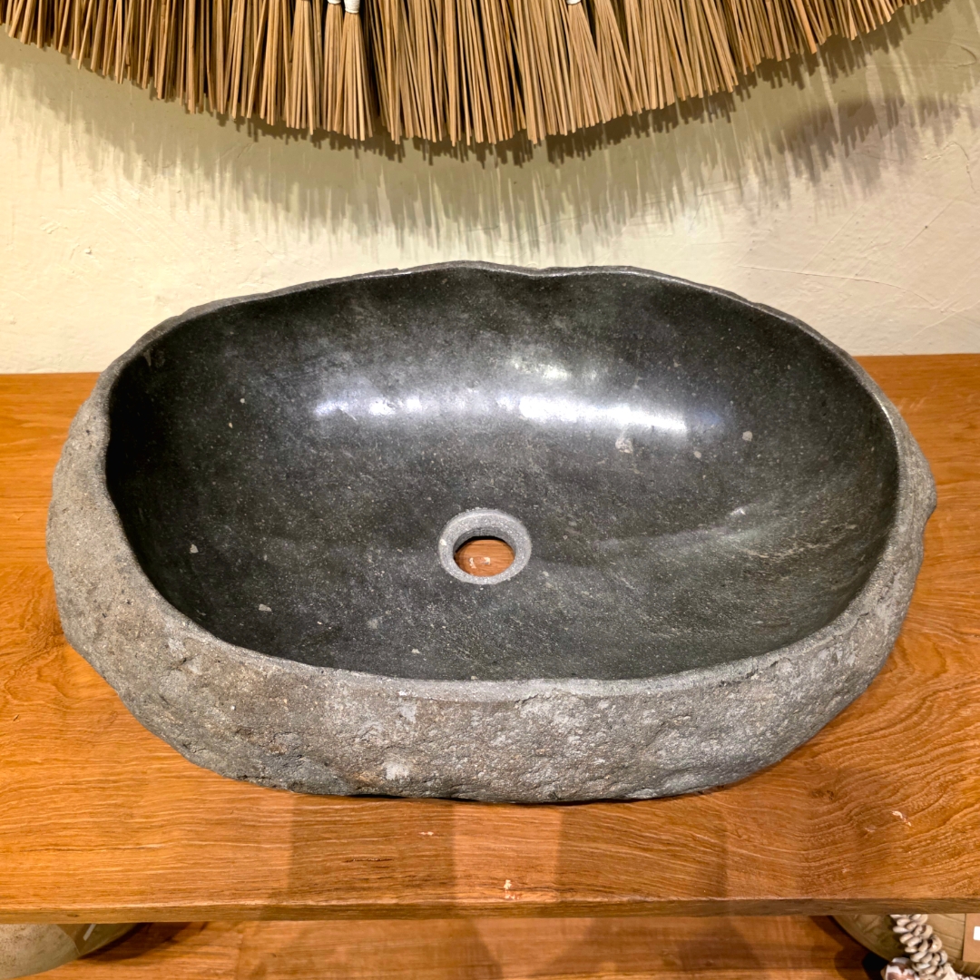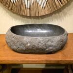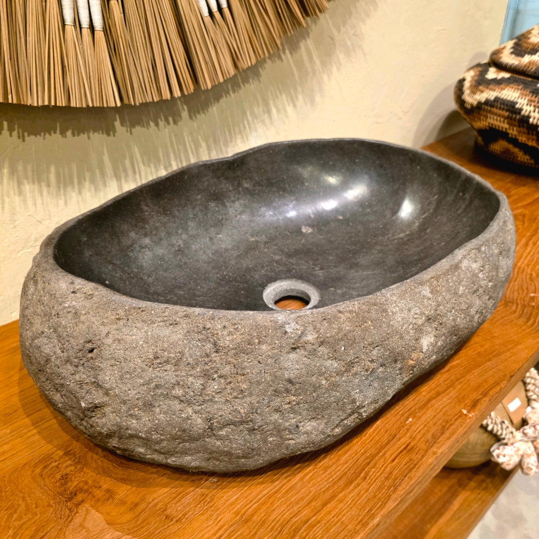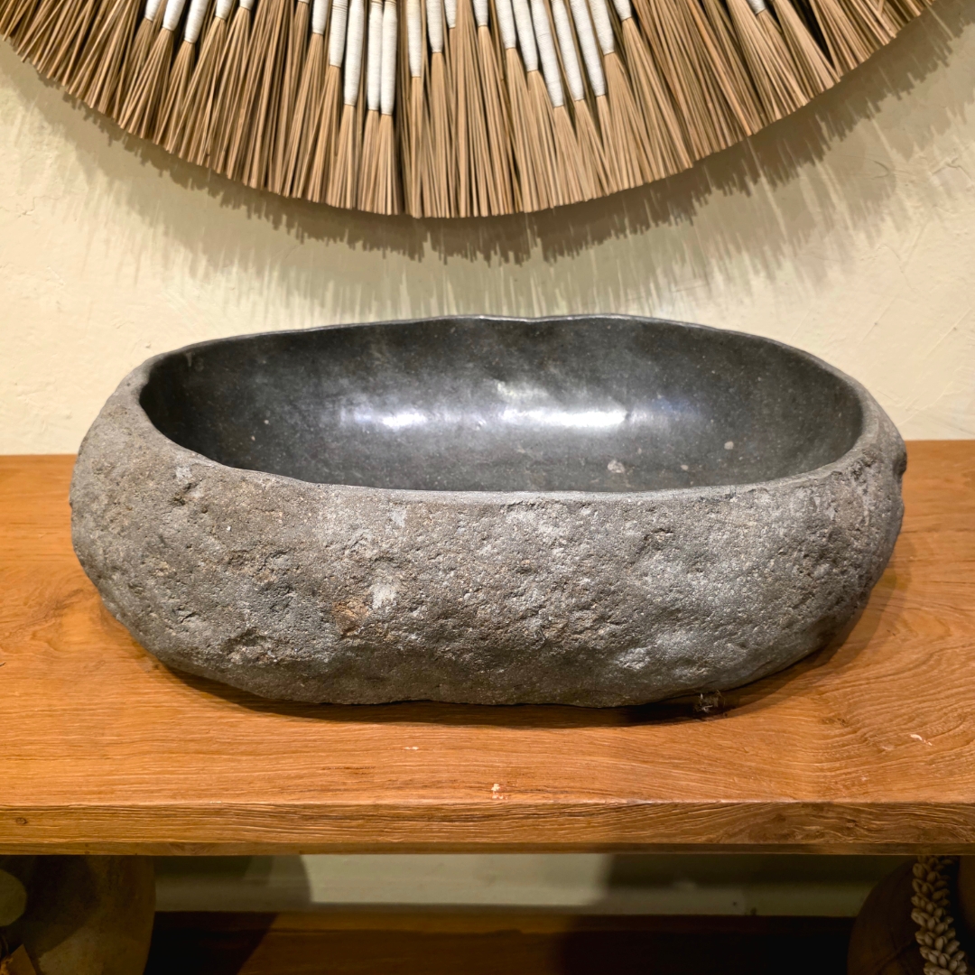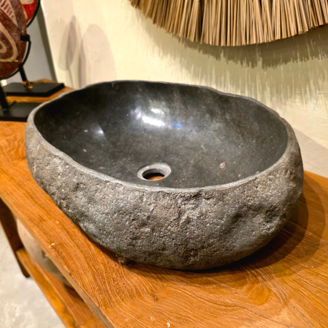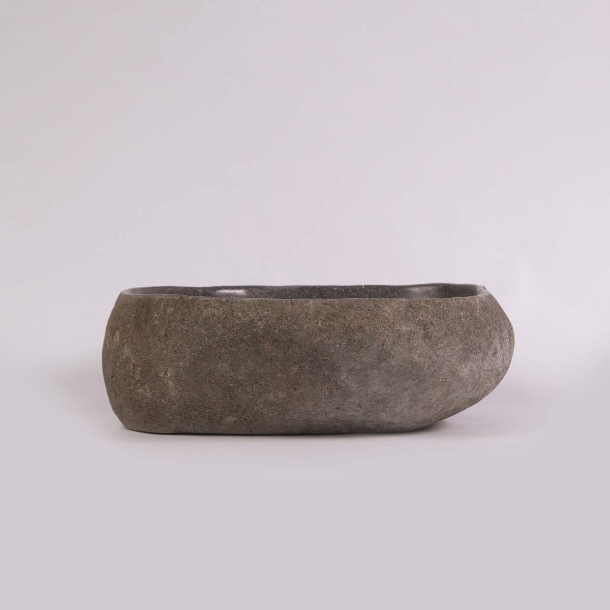Cuba de apoio esculpida em pedra Riverstone com formato orgânico e acabamento rústico. Cada peça é única, preservando as marcas, curvas e texturas originais da rocha, resultando em uma estética bruta e sofisticada. Seu design irregular evoca formas da natureza e garante um toque escultórico ao ambiente.
