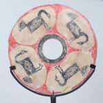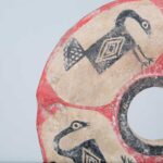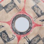 O fundo em tom cru com detalhes em vermelho terroso e preto destaca o contraste gráfico e o valor artístico da peça, ideal para composições com design étnico-contemporâneo.