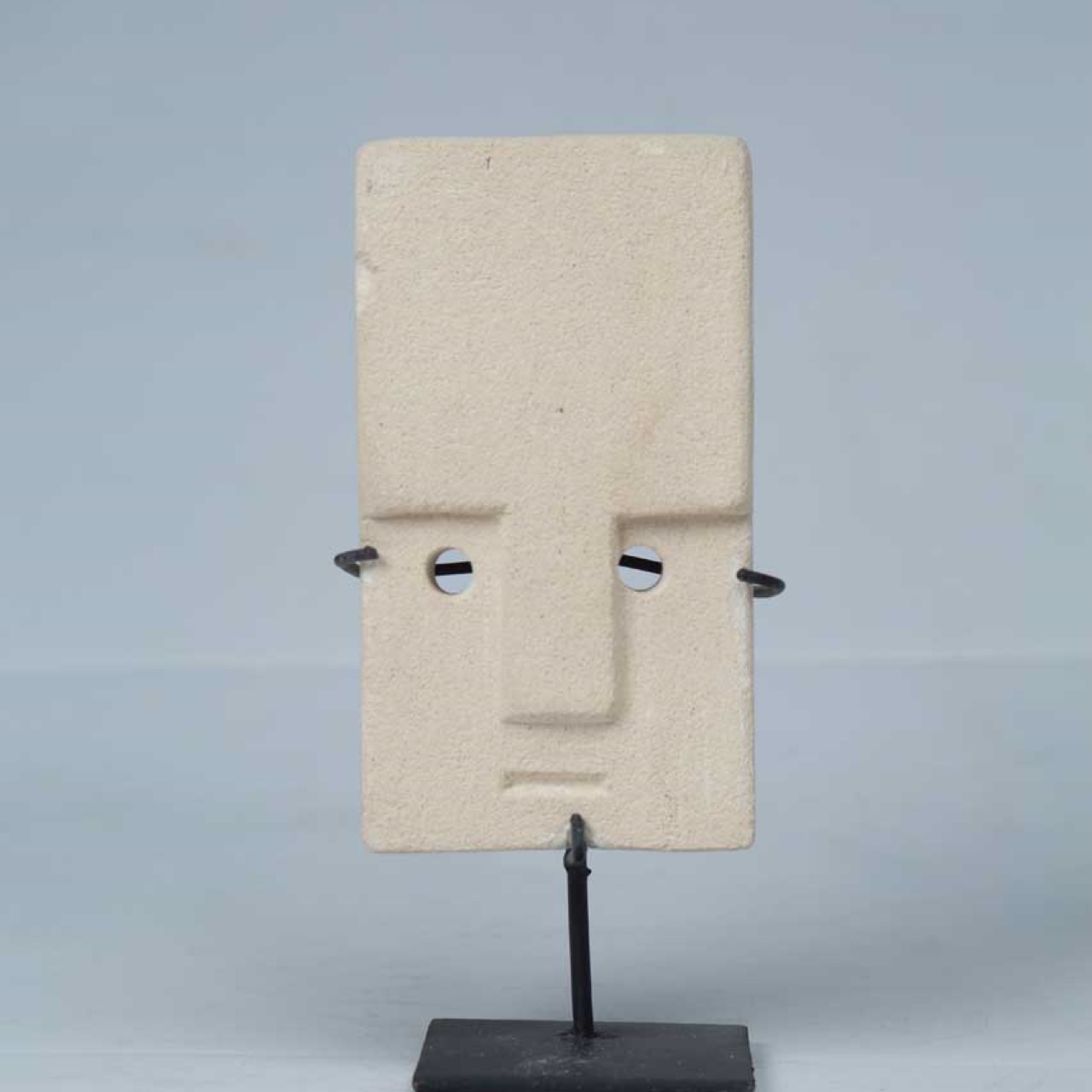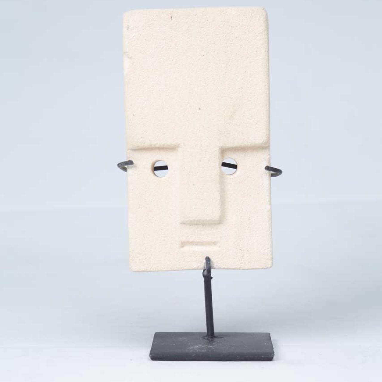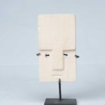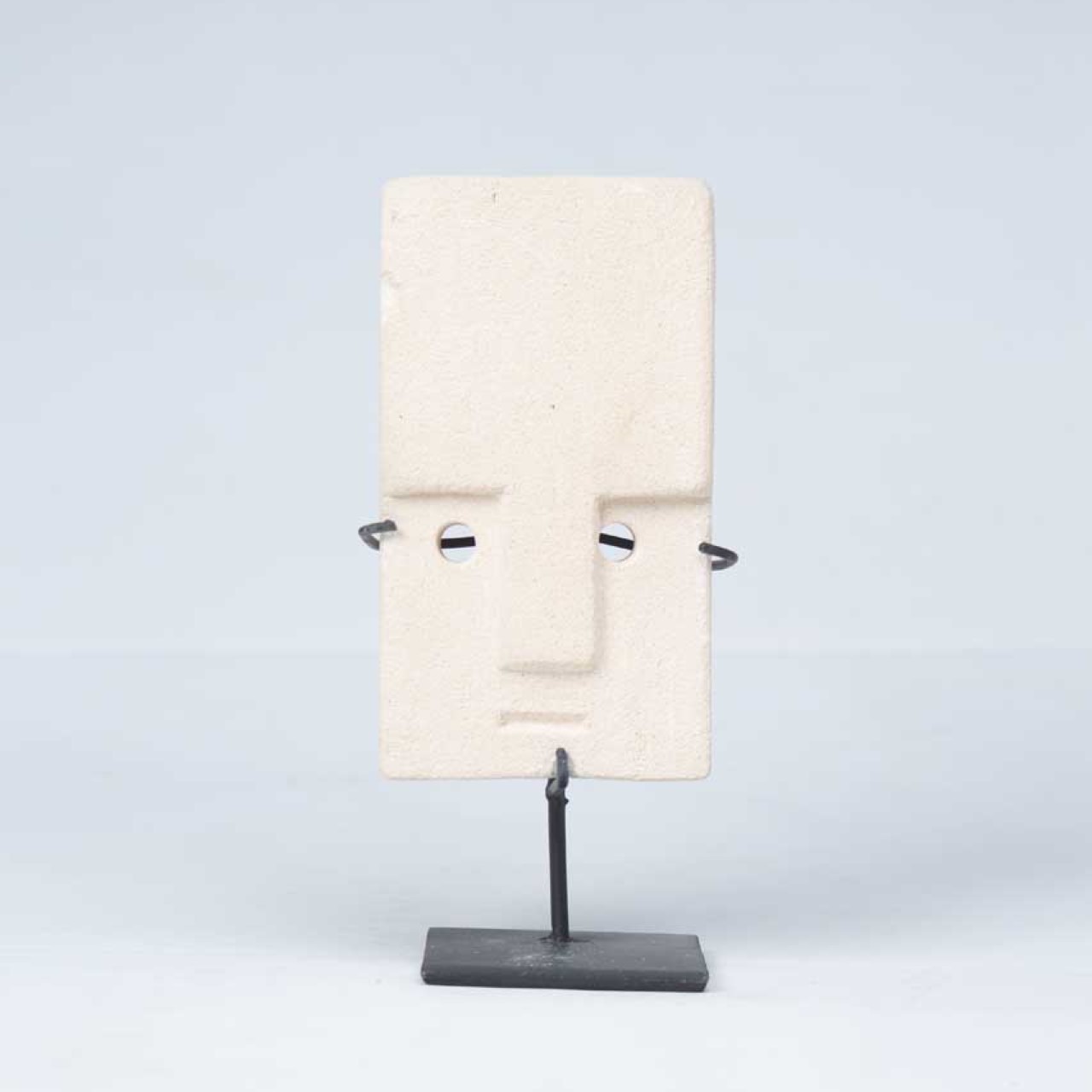 Com uma estética que mescla o brutalismo contemporâneo à simbologia tribal, esta escultura de rosto em pedra natural é uma peça que se destaca pela sua força e simplicidade. Com traços geométricos marcantes e uma expressão enigmática, a obra é fixada sobre uma base de ferro, criando contraste entre o rústico e o industrial.