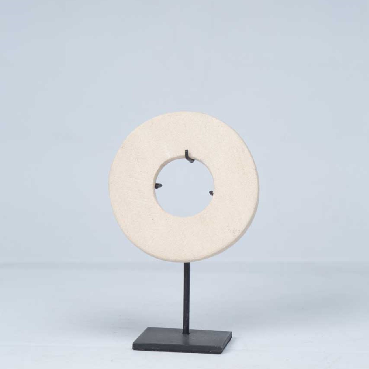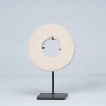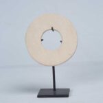 Minimalista e simbólica, esta escultura em formato de disco com base metálica remete aos tradicionais discos de pedra usados como amuletos e elementos de proteção em diversas culturas do Sudeste Asiático. Esculpida em pedra clara e sustentada por um pedestal de ferro, é uma peça que evoca equilíbrio, força e serenidade, ideal para compor estantes, aparadores ou ambientes zen.