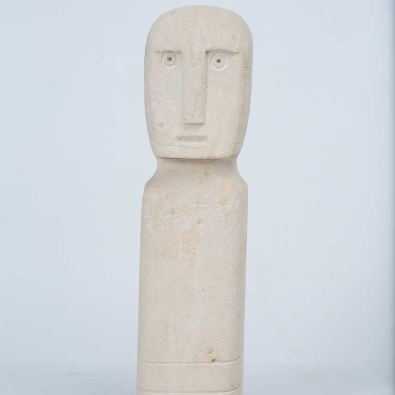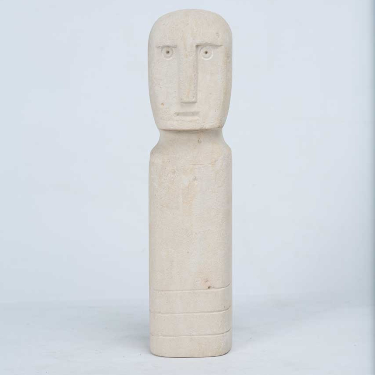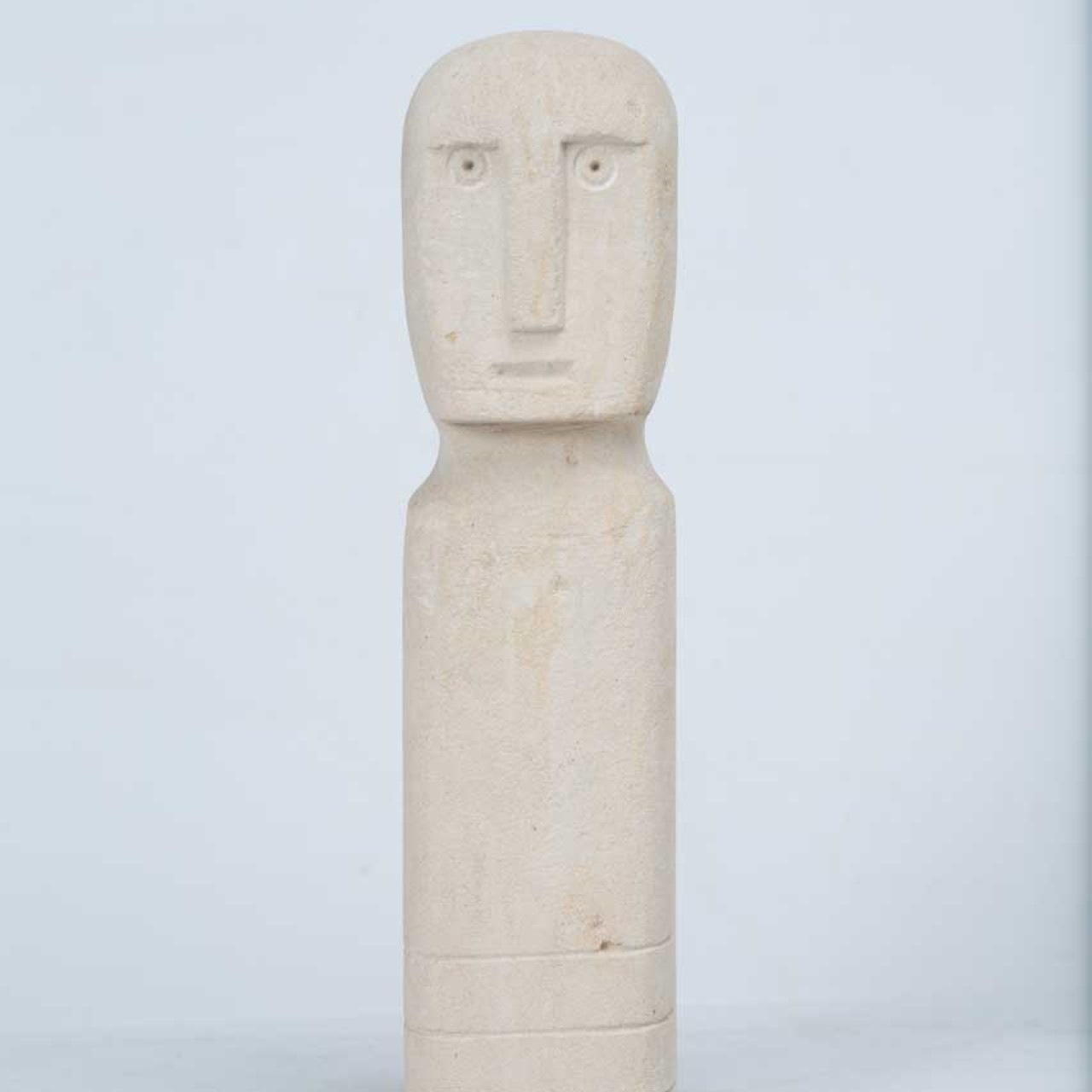 Entalhada manualmente em pedra natural, a peça representa um rosto humano de traços simples e marcantes — uma presença silenciosa que transmite equilíbrio, proteção e autenticidade ao ambiente.