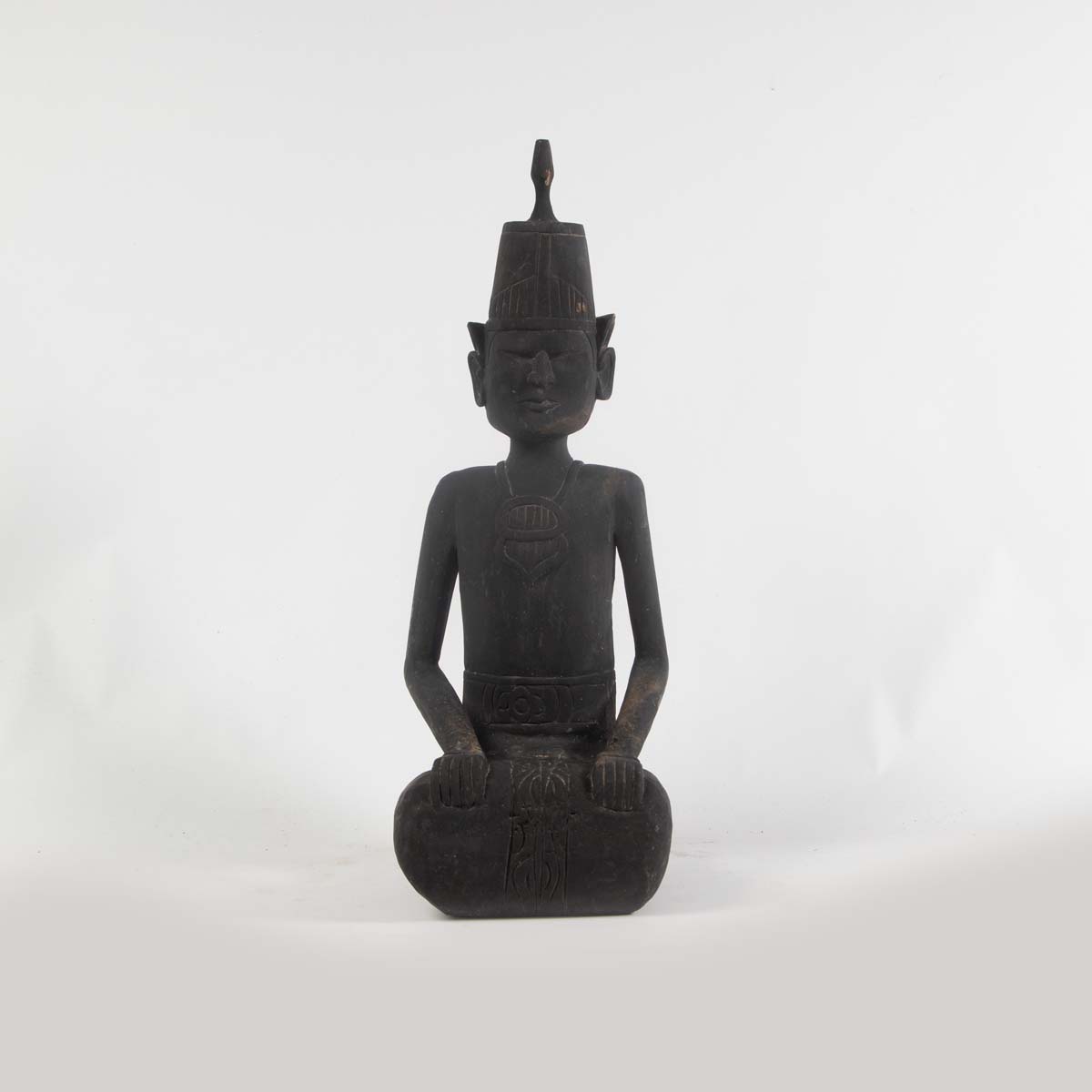 Essa escultura representa uma figura cerimonial sentada, com traços que evocam sabedoria e solenidade. O chapéu alto esculpido faz referência a trajes típicos usados em rituais tradicionais balineses. Produzida artesanalmente em material que simula pedra vulcânica, é uma peça que impõe respeito e eleva a energia do ambiente.