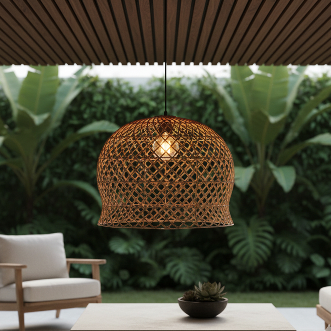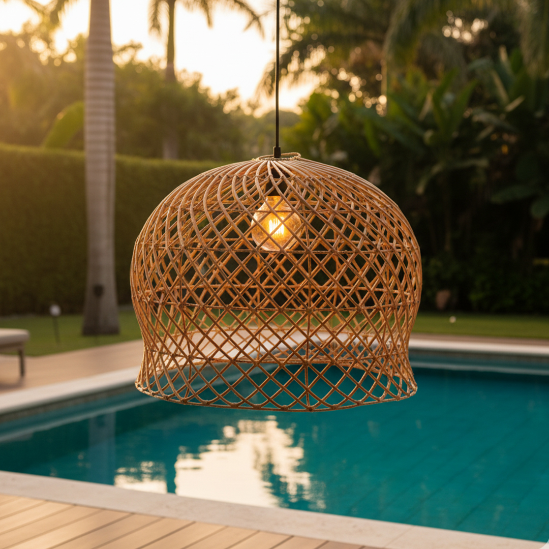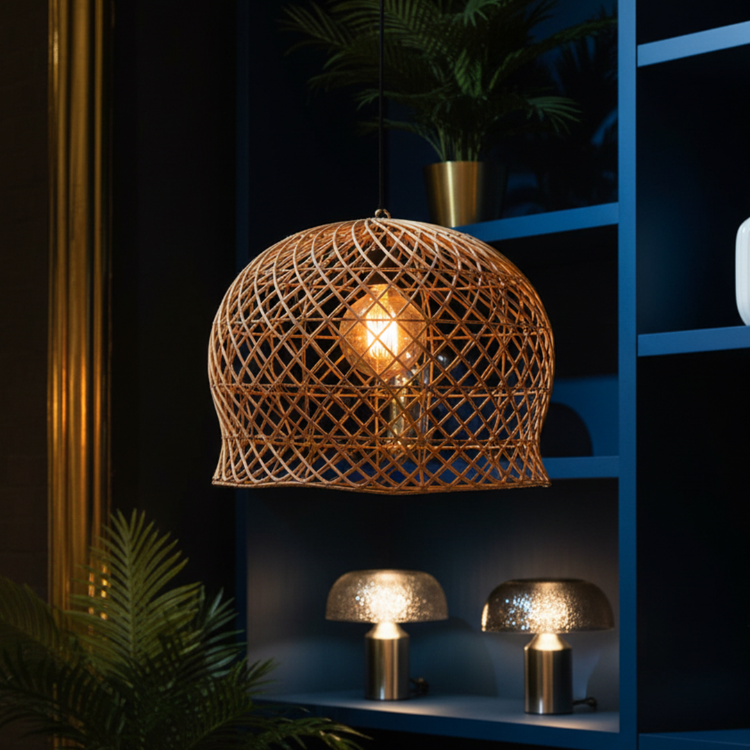 Inspirada nas formas suaves e nos materiais puros da natureza, esta luminária pendente é tecida manualmente em rattan natural, revelando um padrão geométrico fluido e envolvente. Sua cúpula ampla e leve cria uma iluminação difusa e acolhedora, ideal para ambientes que buscam aconchego e autenticidade.