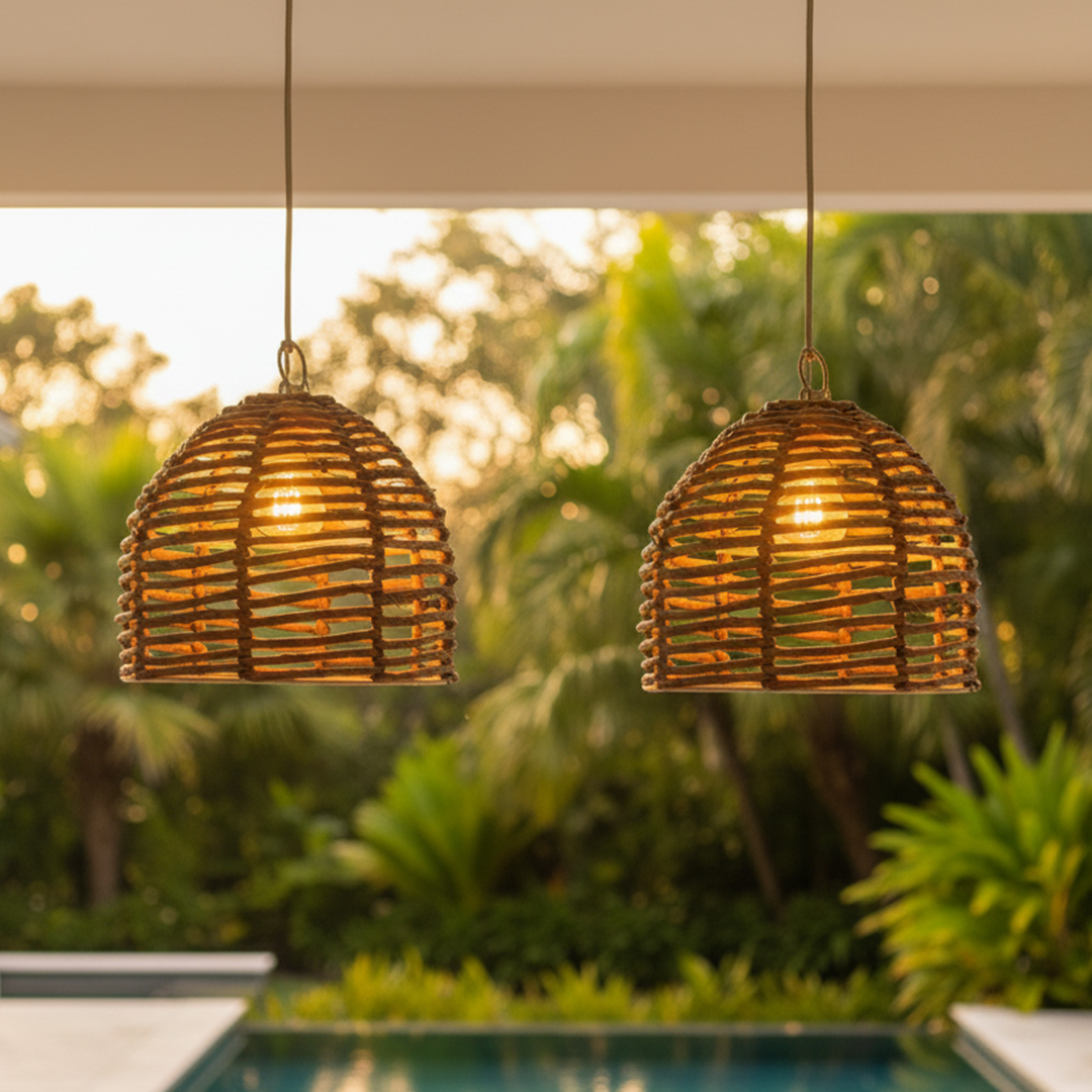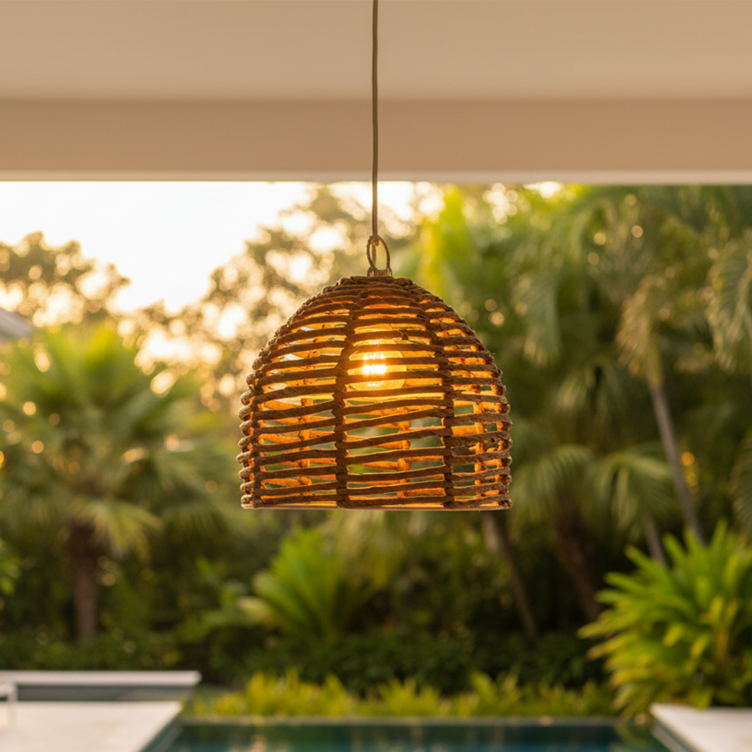 Luminária pendente artesanal em Fibra de Bananeira natural escurecido, com estrutura robusta e trançado manual. Seu formato em cúpula promove iluminação difusa e acolhedora, ideal para criar atmosferas intimistas em ambientes residenciais ou comerciais. Combina com estilos rústico, boho, natural e étnico.