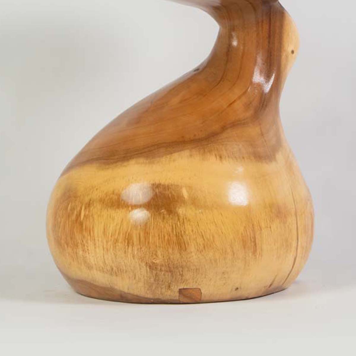 Esculpido em madeira maciça com acabamento polido que realça os veios naturais e os tons quentes da madeira. Seu design orgânico e fluido combina funcionalidade com estética artística, sendo ideal para ambientes sofisticados e criativos.
